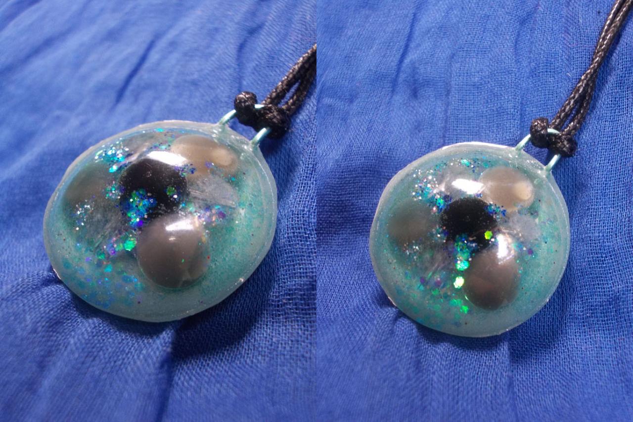 Pendentif avec pierre de lune noire, obsidienne noire et aigue-marine.